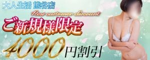まだ大人生活熊谷店を知らないお客様に当店の魅力を知っていただきたいっ……!! そんな願いを込めまして、大人生活熊谷店をご利用のはじめてのお客様に限りなんと!! 全コース初回4000…